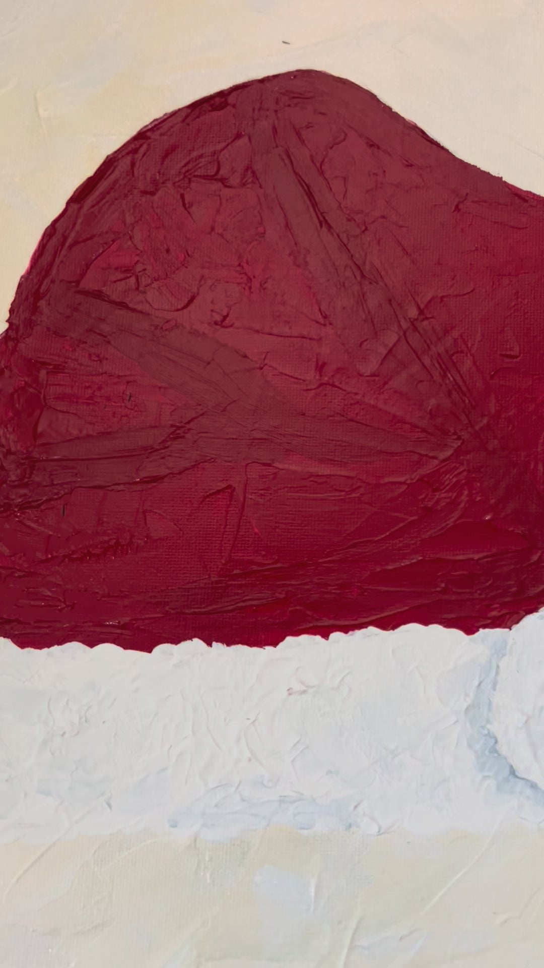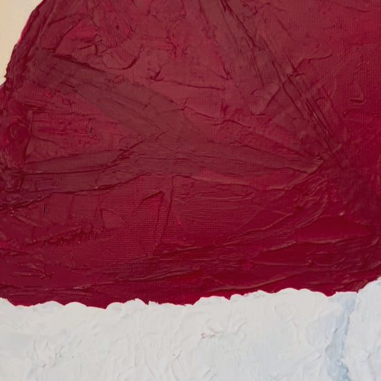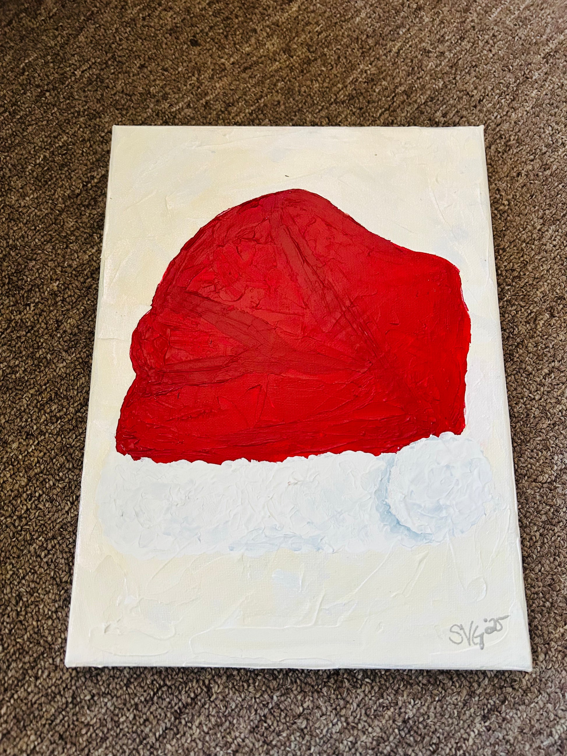 Santa hat very red and puffy white with off white and white mix with glitter in the background. Perfect for holiday decor, gift for lovers!