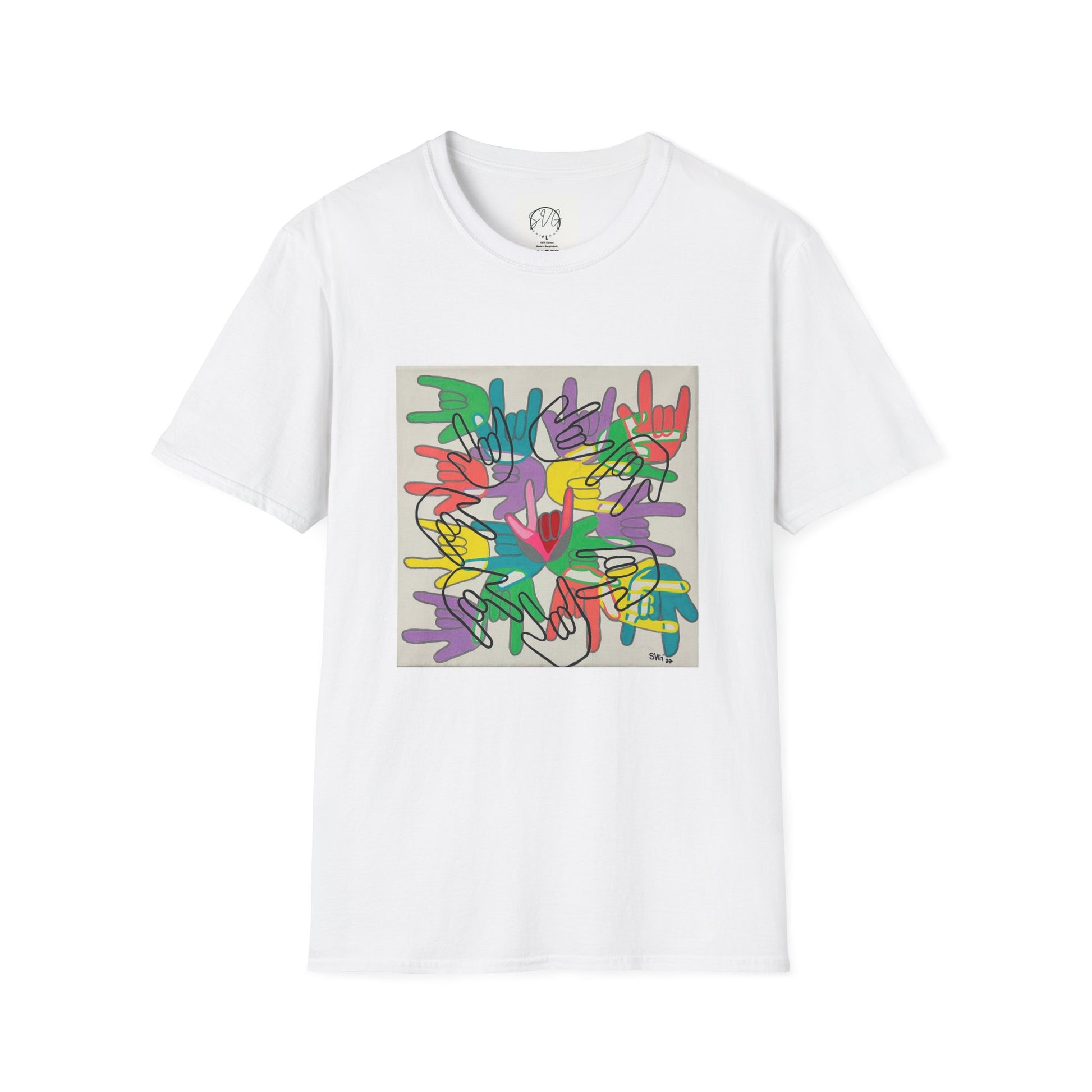 Bright, loose, and unapologetically playful — this lightweight cotton tee turns everyday wear into a small canvas of joy. A bold, abstract print sits on a clean white field, composed of layered, hand-drawn shapes and vibrant pops of green, purple, yellow, red and blue. It feels like an upbeat scribble captured mid-movement: energetic, artful, and easy to wear. The classic crew neckline and relaxed fit let the print do the talking while staying comfortable from morning coffee runs to late-night gallery hangs. Built from soft ring-spun cotton with reinforced shoulder tape and a ribbed collar that keeps its shape, this shirt wears well and washes well. It’s for people who collect color, love tactile, honest clothing, and want something lighthearted yet thoughtfully made in their everyday rotation.